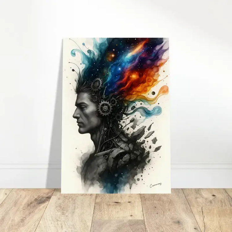 Un être hybride de chair, de métal et de feu cosmique. Des engrenages remplacent la pensée, des circuits captent la lumière des étoiles. Des galaxies jaillissent de sa tête – non par hasard, mais comme preuve que l'esprit est plus que de la biologie.