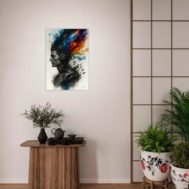 Un être hybride de chair, de métal et de feu cosmique. Des engrenages remplacent la pensée, des circuits tendent vers la lumière des étoiles. Des galaxies jaillissent de sa tête – non par hasard, mais comme preuve que l'esprit est plus que de la biologie.